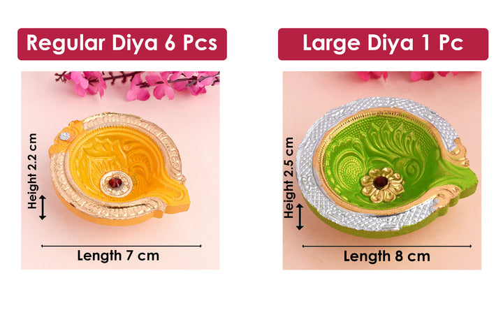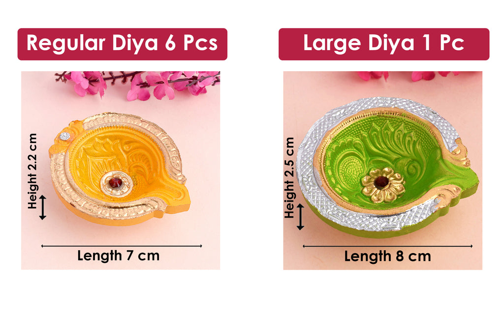 • Product Details: Material: Clay/Terracotta Dimensions: Regular Diya Height: 2.2cm, Length: 7cm, Large Diya Height: 2.5cm, Length: 8cm,Β Weight: 700gram, Finish Type: Glossy.