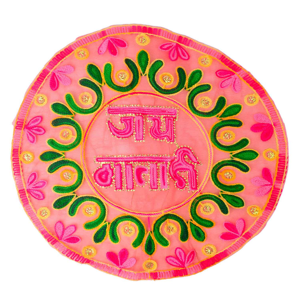 Pink Organza Thali Cover | Jai Mata Di Thal Posh | Jai Mata Di Thali Cover | Thali Decoration Cloth | Mata Ka Poshak | Devi Pooja Accessories | Navratri Pooja Decor | Spiritual Thal Cover | Durga Pooja Essentials | Sacred Pooja Cloth