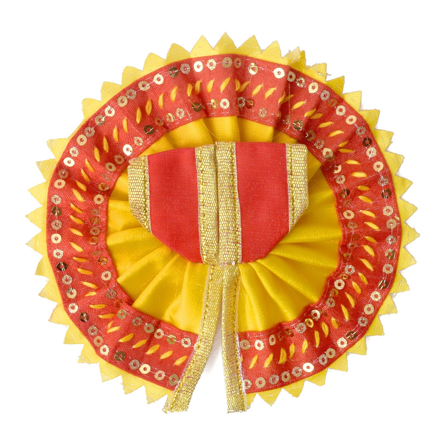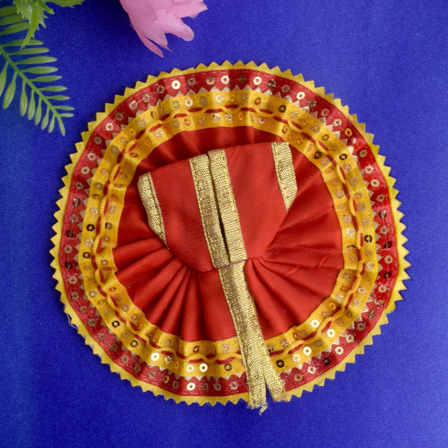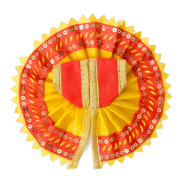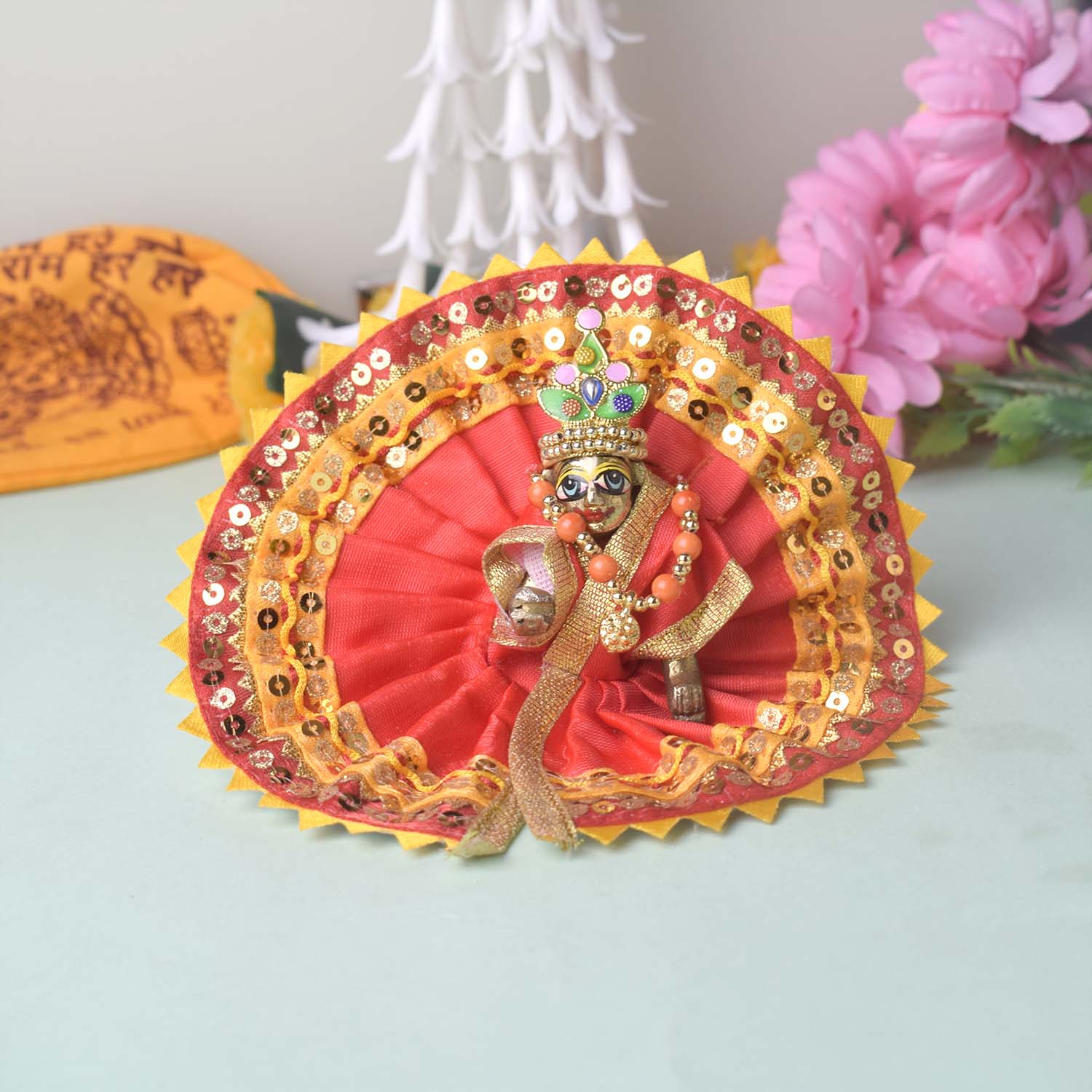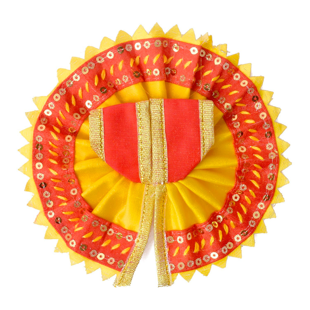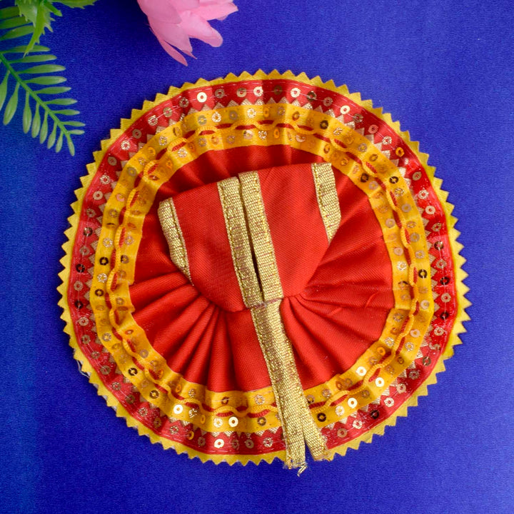 Give your Laddu Gopal a sparkling touch of elegance with this radiant yellow and red dress adorned with a shimmering sequin border. Beautifully crafted from quality fabric, it showcases bright hues and dazzling details that enhance the divine charm of your deity.