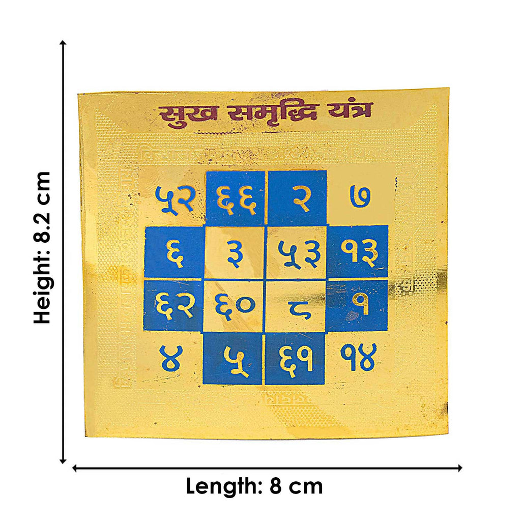 The Sukh Samridhi Yantra is a powerful yantra designed to bring prosperity, wealth, and happiness into your life. It invokes the divine blessings of Goddess Lakshmi and other deities associated with wealth and well-being. This yantra helps the worshipper to attract material and spiritual success, ensuring financial stability, good health, and overall happiness. Ideal for those seeking to enhance their fortune and achieve contentment in life.