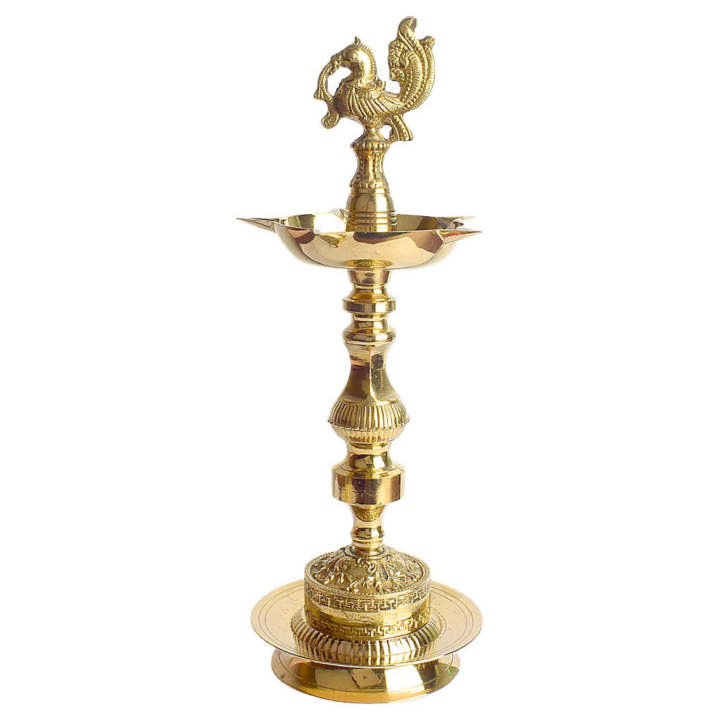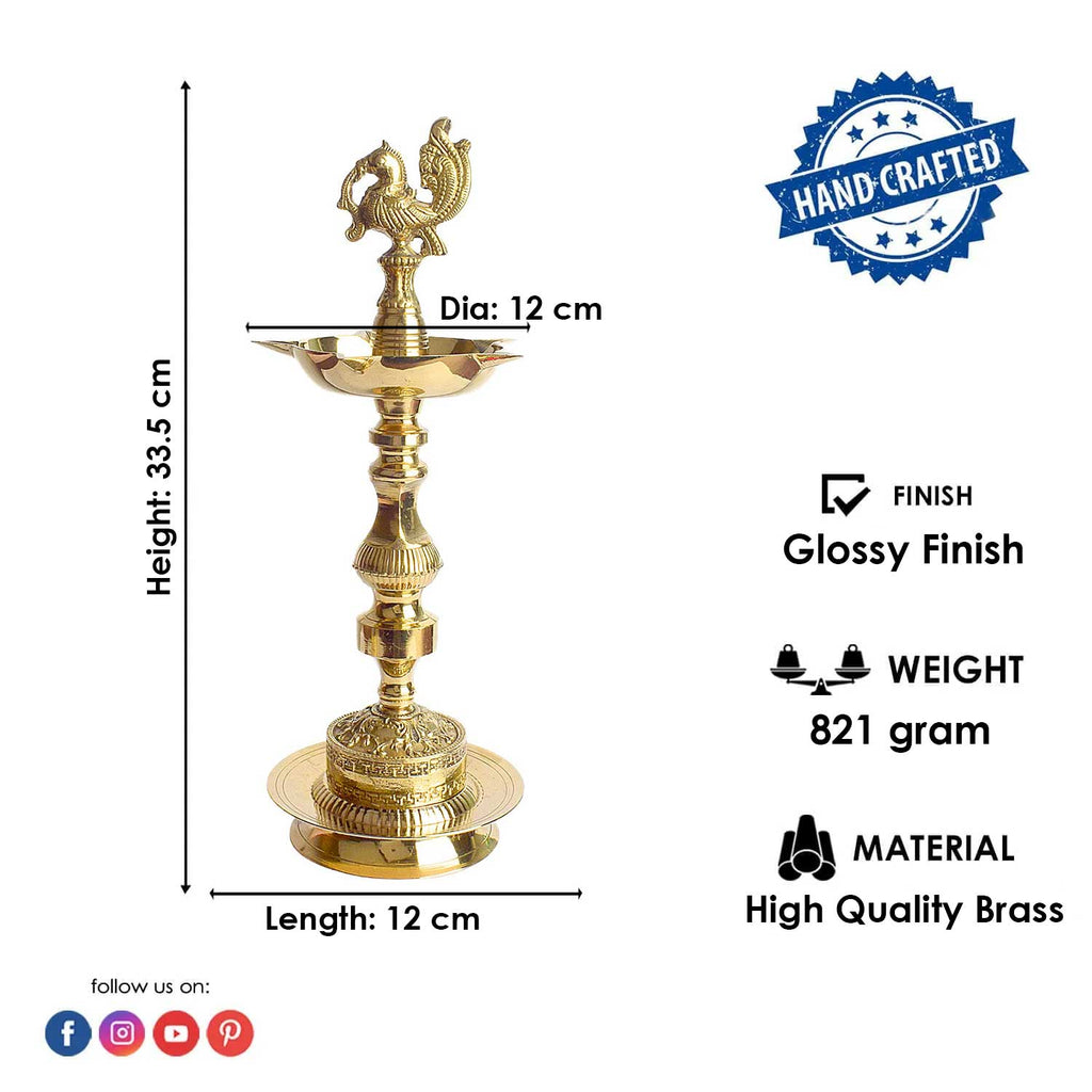 • Item Name: 13 Inch Brass 1 Step Embossed Peacock Kerala Stand Diya