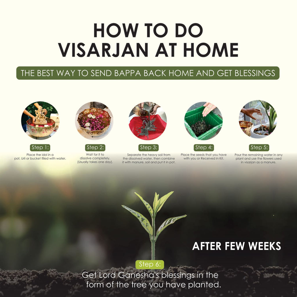 After ten days, on Ganeshotsav, also known as Ganesh Visarjan Day, devotees immerse the statue of Lord Ganesh in a river, sea, or other body of water. This results in significant water pollution and is not practical in many urban areas. Because visarjan of Ganpati into river or sea water is not possible in many cities, the idea behind eco-friendly Ganpati is to dissolve Ganpati in water in a container or bucket and release it onto a tree or plant.