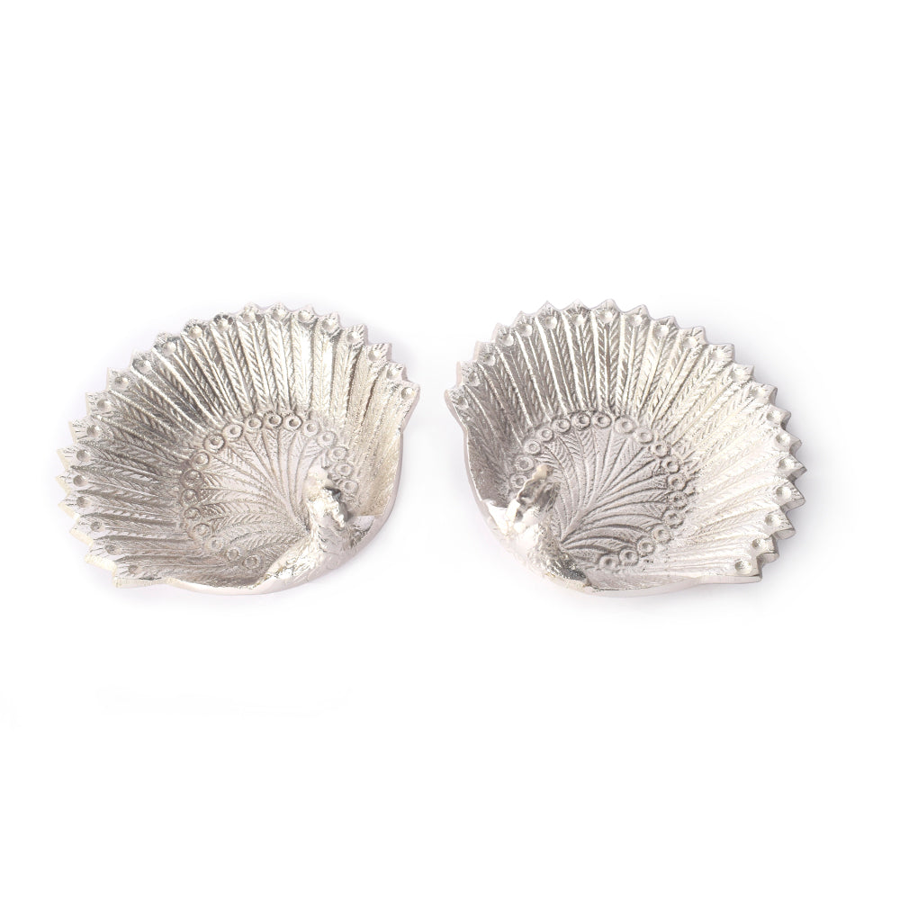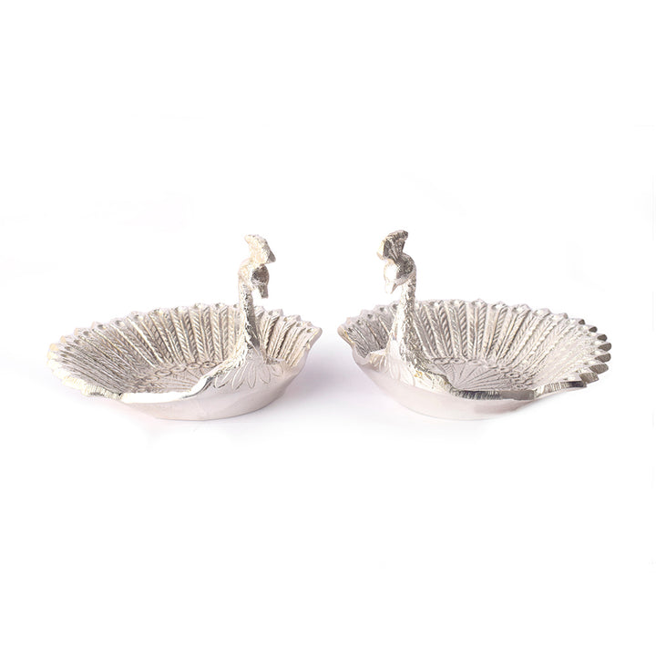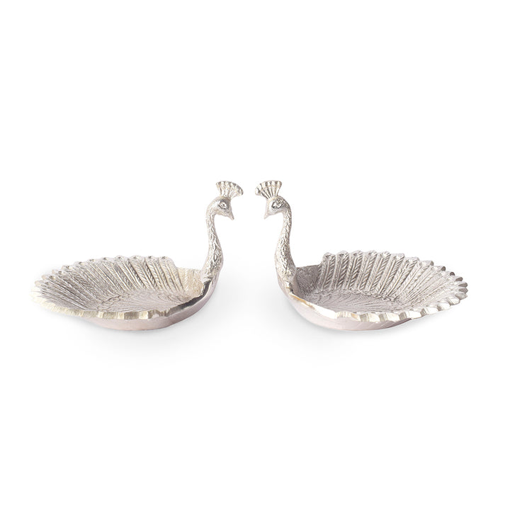 Silver Peacock tray | Silver plated Peacock tray | Metal Peacock tray for pooja | Silver decorative tray | Silver Peacock serving tray | Silver tray for dry fruits | Silver Peacock pooja accessory | Silver Peacock design platter | Silver Peacock tray for gifting | Traditional silver Peacock tray