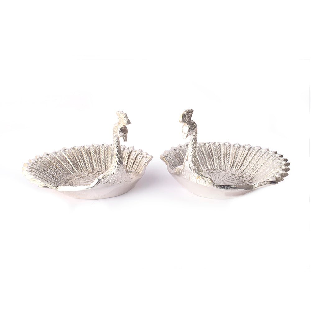 About Product: The Silver Peacock Tray is a beautifully handcrafted decorative and functional tray featuring an elegant Peacock design. Made entirely of metal with a fine silver-plated finish, it exudes traditional charm and durability without any resin base. This versatile tray is ideal for pooja offerings, serving dry fruits, sweets, or as a centerpiece for festive décor. Its artistic design not only enhances your home temple but also serves as a stylish addition to your dining or living space. The Peacock motif symbolizes grace and prosperity, making this tray a perfect blend of utility and spirituality.