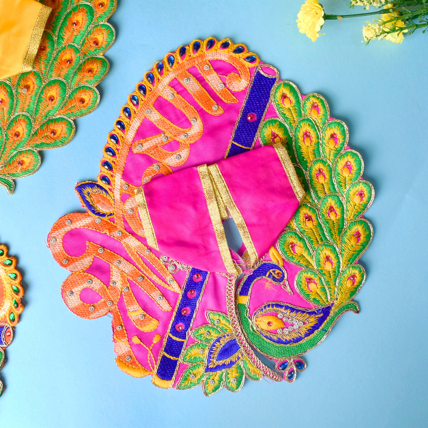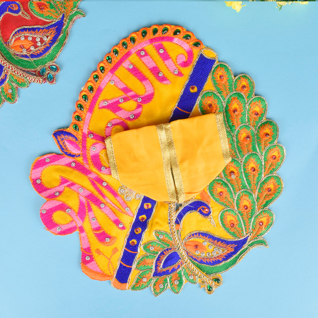 Multicolor peacock design dresses for Laddu Gopal | Embroidered Krishna dresses | Bal Gopal vastra | Laddu Gopal pooja clothes | Handmade Krishna dress | Designer Bal Gopal outfit | Krishna idol dress online | Peacock motif Krishna dress | Pooja accessories | Krishna devotional dress