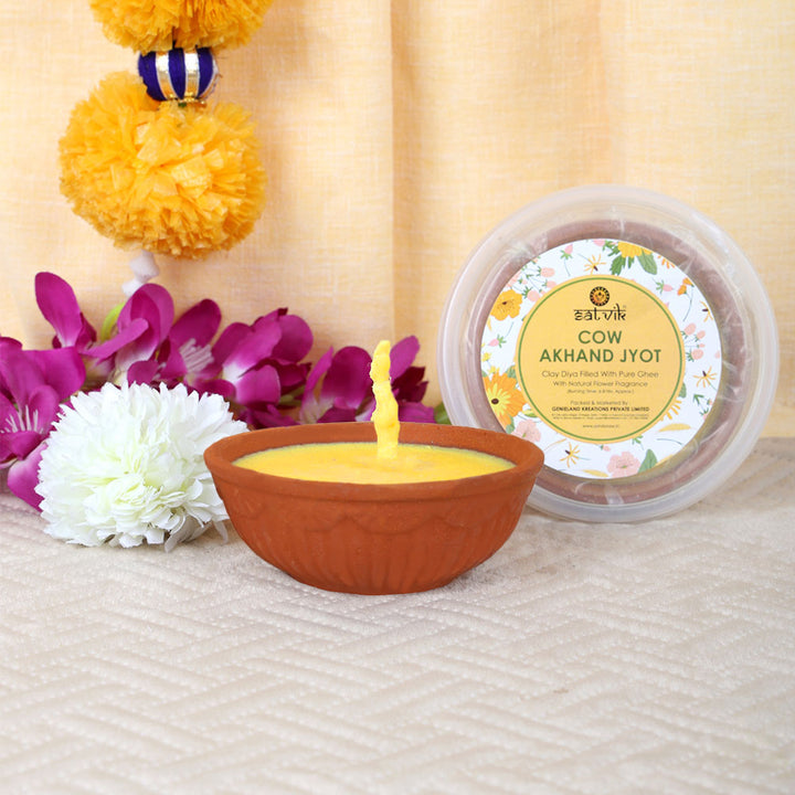 Satvik pure cow ghee akhand jyot | 6 to 8 hours burning clay diya | cow ghee akhand jyot diya | long burning akhand jyot diya | eco-friendly cow ghee diya | pure ghee akhand diya for pooja | traditional clay diya india | spiritual akhand jyot diya | handmade cow ghee diya | satvikstore akhand jyot diya
