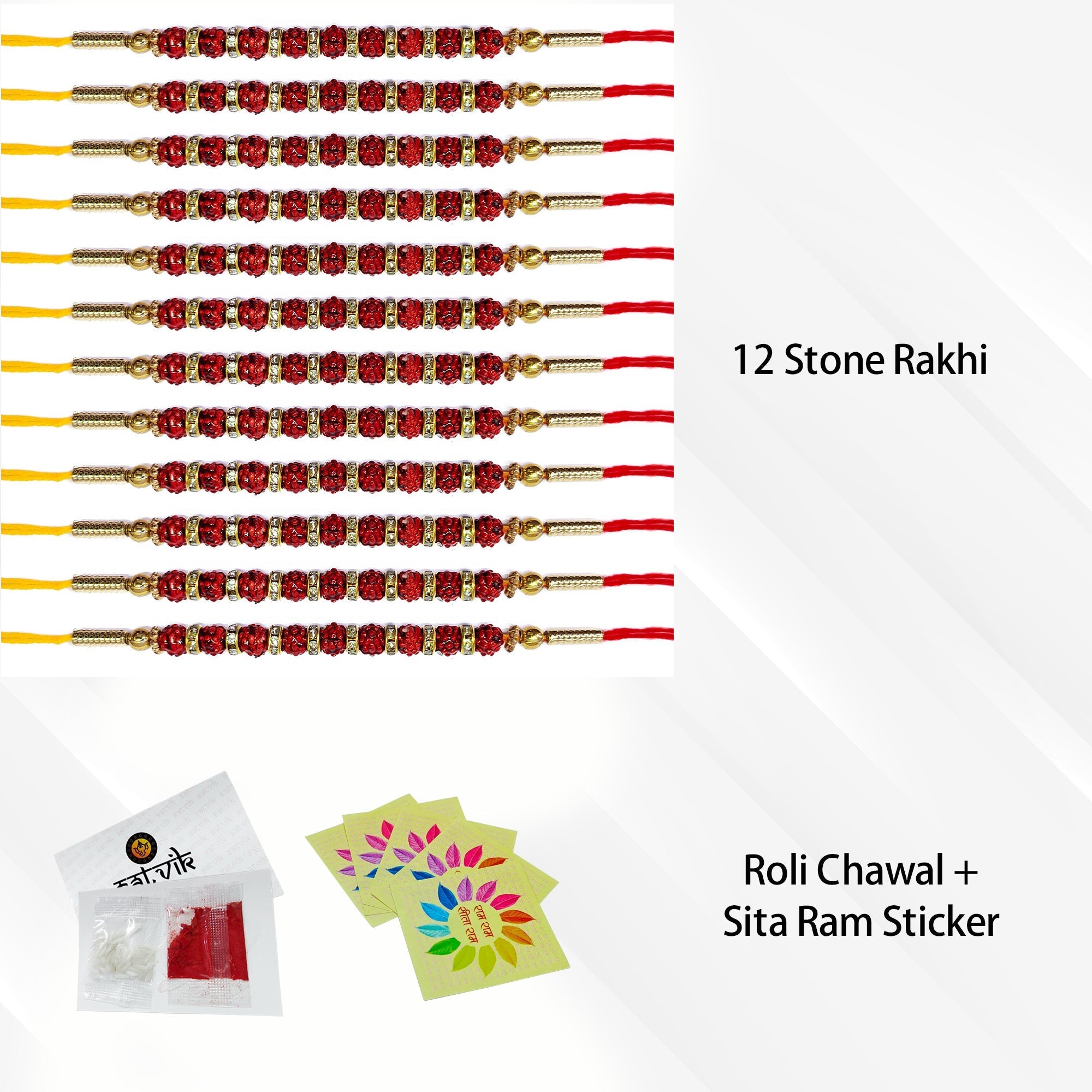 • Package: Set of 12 Piece Rakhies with Tilak set ( Roli Chawal ) and Holy Soun ( Ram Sita Stickers). All Rakhi are same as shown in picture.