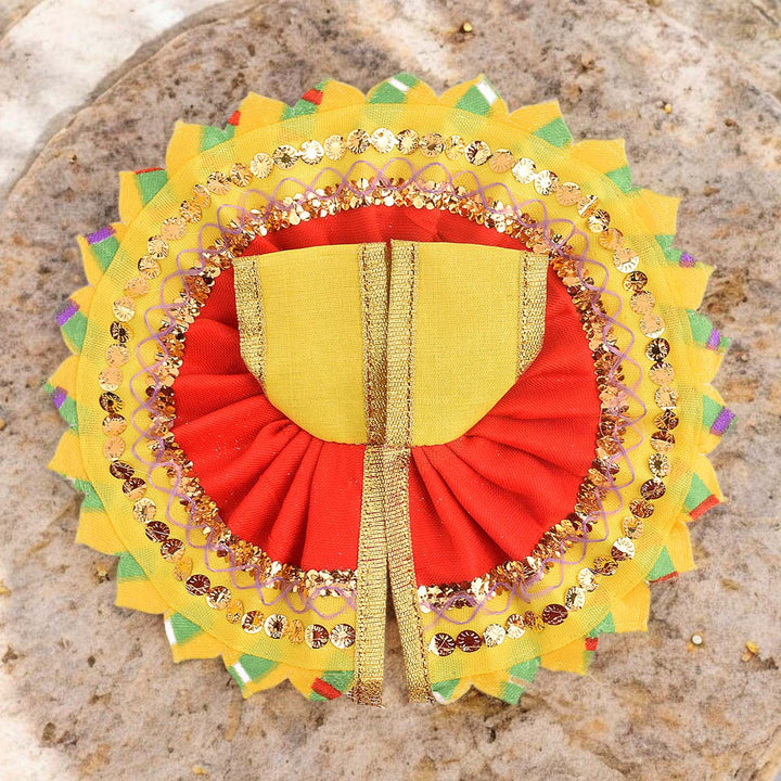 Infuse your Laddu Gopal’s attire with vibrant charm through this beautifully crafted red-yellow dress. Made from quality fabric, it blends rich hues of red and yellow, creating a lively and devotional look for your deity.