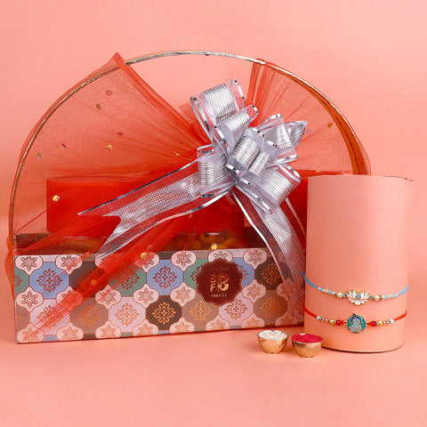 Accompanying the Rakhi is a thoughtfully curated gift hamper, designed to delight your dear Bhaiya with a selection of his favorite treats, chocolates, or thoughtful keepsakes. The hamper is carefully packed, ensuring that every element is of the finest quality and chosen with love, making it a truly heartwarming gift.