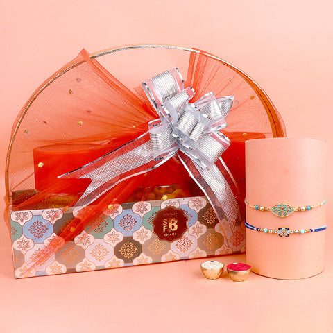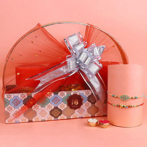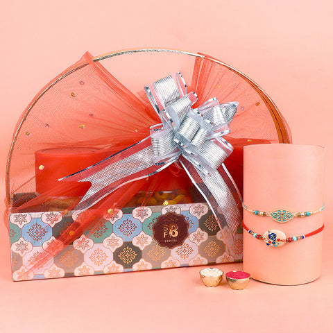 Our Bhaiya Rakhi with Gift Hamper is a delightful combination that includes a beautifully handcrafted Rakhi, lovingly designed to symbolize the bond between siblings, along with an assorted gift hamper packed with goodies and tokens of affection. This exclusive Rakhi hamper is a perfect way to shower your brother with love and blessings on this auspicious day.