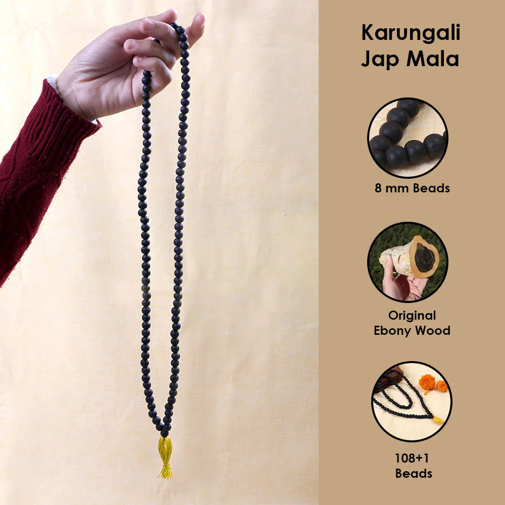 • Material: Mala beads made from tested and certified Ebony wood (Karungali) by the Central Wood Testing Laboratory, Rubber Board, Govt. of India.